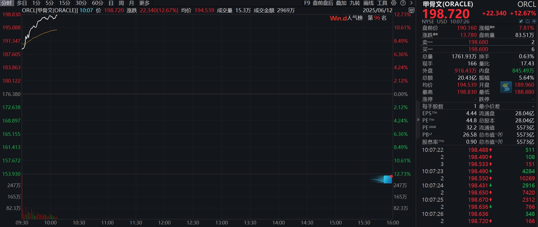 22:27 甲骨文股价延续涨势,日内涨14%,股价盘中创历史新高。